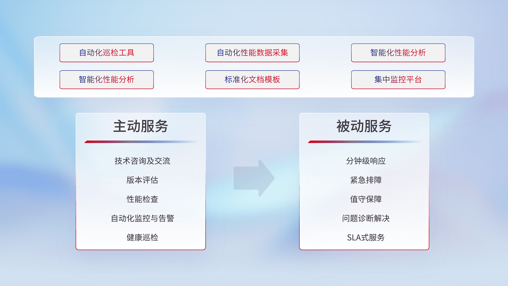 智能化工具和标准化文档,,保障服务质量,,,,提供主动服务(包含技术咨询、、、、版本评估、、性能检查、、、、自动化监控与告警、、、健康巡检)和被动服务包含(分钟级响应、、、、紧急排障、、、值守保障、、、、问题诊断解决、、SLA服务)。。。。