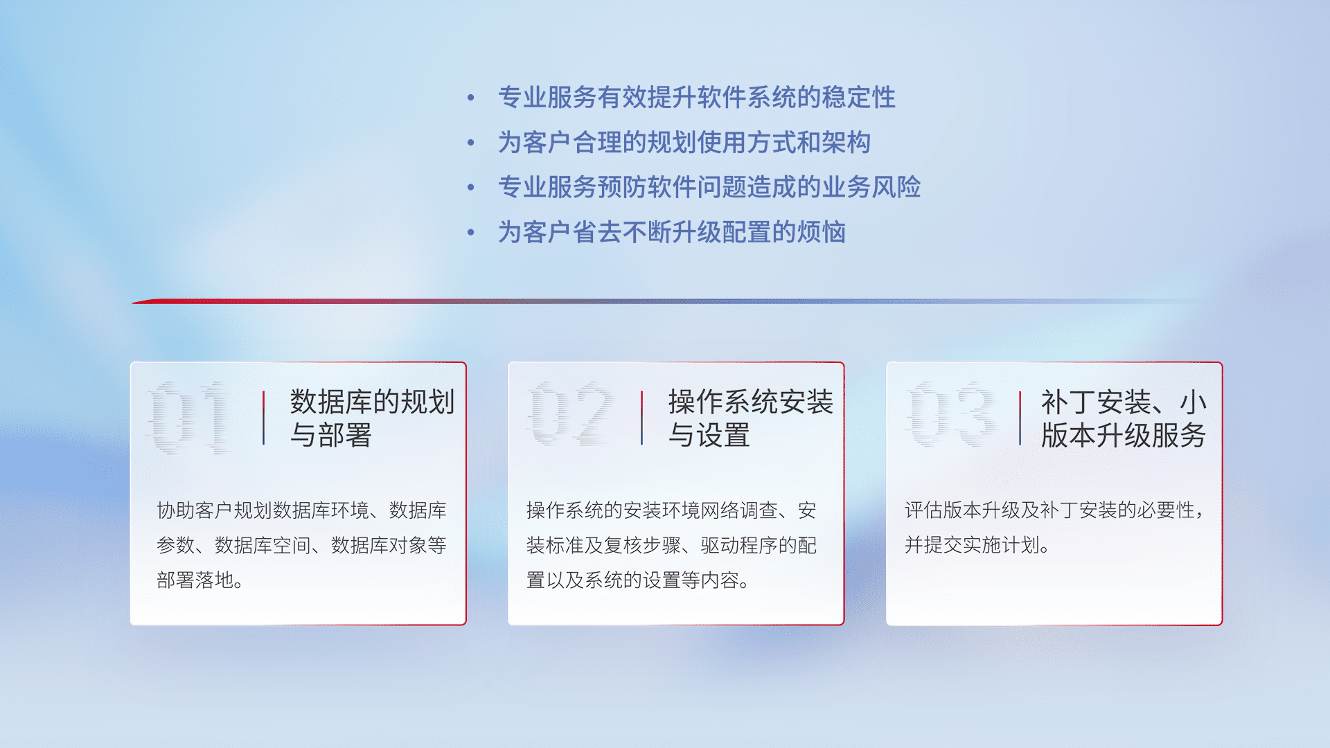 为客户提供软件规模升级、、、快速部署、、按需配置的专业服务,,从数据库的规划与部署到操作系统的安装与设置,,,再到补丁安装和小版本升级提供支持。。。